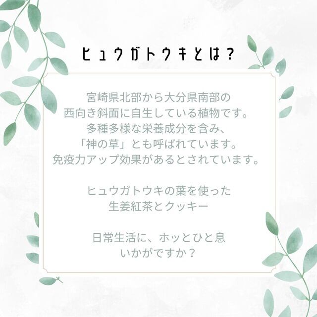 宮崎県高千穂町で栽培された希少な和漢植物「ヒュウガトウキ(日本山人参)」の葉を、宮崎県木城町産の香り高い生姜とブレンドした体にやさしい紅茶です。